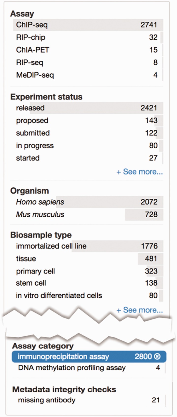 The Encyclopedia of DNA elements (ENCODE) project is an ongoing collaborative effort to create a catalog of genomic annotations. To date, the project has generated over 4000 experiments across more than 350 cell lines and tissues using a wide array of experimental techniques to study the chromatin structure, regulatory network and transcriptional landscape of the Homo sapiens and Mus musculus genomes. All ENCODE experimental data, metadata and associated computational analyses are submitted to the ENCODE Data Coordination Center (DCC) for validation, tracking, storage and distribution to community resources and the scientific community. As the volume of data increases, the organization of experimental details becomes increasingly complicated and demands careful curation to identify related experiments. Here, we describe the ENCODE DCC's use of ontologies to standardize experimental metadata. We discuss how ontologies, when used to annotate metadata, provide improved searching capabilities and facilitate the ability to find connections within a set of experiments. Additionally, we provide examples of how ontologies are used to annotate ENCODE metadata and how the annotations can be identified via ontology-driven searches at the ENCODE portal. As genomic datasets grow larger and more interconnected, standardization of metadata becomes increasingly vital to allow for exploration and comparison of data between different scientific projects.