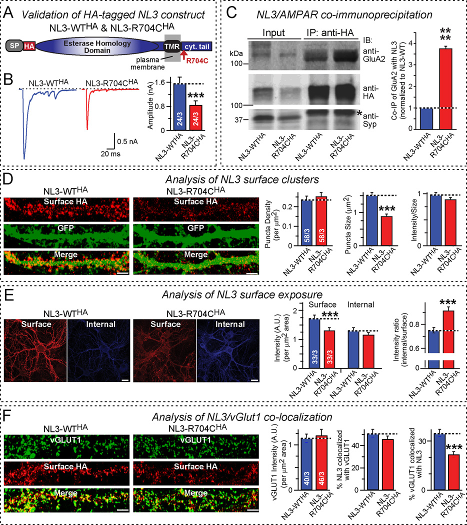 Neuroligins are postsynaptic cell-adhesion molecules that bind to presynaptic neurexins. Although the general synaptic role of neuroligins is undisputed, their specific functions at a synapse remain unclear, even controversial. Moreover, many neuroligin gene mutations were associated with autism, but the pathophysiological relevance of these mutations is often unknown, and their mechanisms of action uninvestigated. Here, we examine the synaptic effects of an autism-associated neuroligin-4 substitution (called R704C), which mutates a cytoplasmic arginine residue that is conserved in all neuroligins. We show that the R704C mutation, when introduced into neuroligin-3, enhances the interaction between neuroligin-3 and AMPA receptors, increases AMPA-receptor internalization and decreases postsynaptic AMPA-receptor levels. When introduced into neuroligin-4, conversely, the R704C mutation unexpectedly elevated AMPA-receptor-mediated synaptic responses. These results suggest a general functional link between neuroligins and AMPA receptors, indicate that both neuroligin-3 and -4 act at excitatory synapses but perform surprisingly distinct functions, and demonstrate that the R704C mutation significantly impairs the normal function of neuroligin-4, thereby validating its pathogenicity.