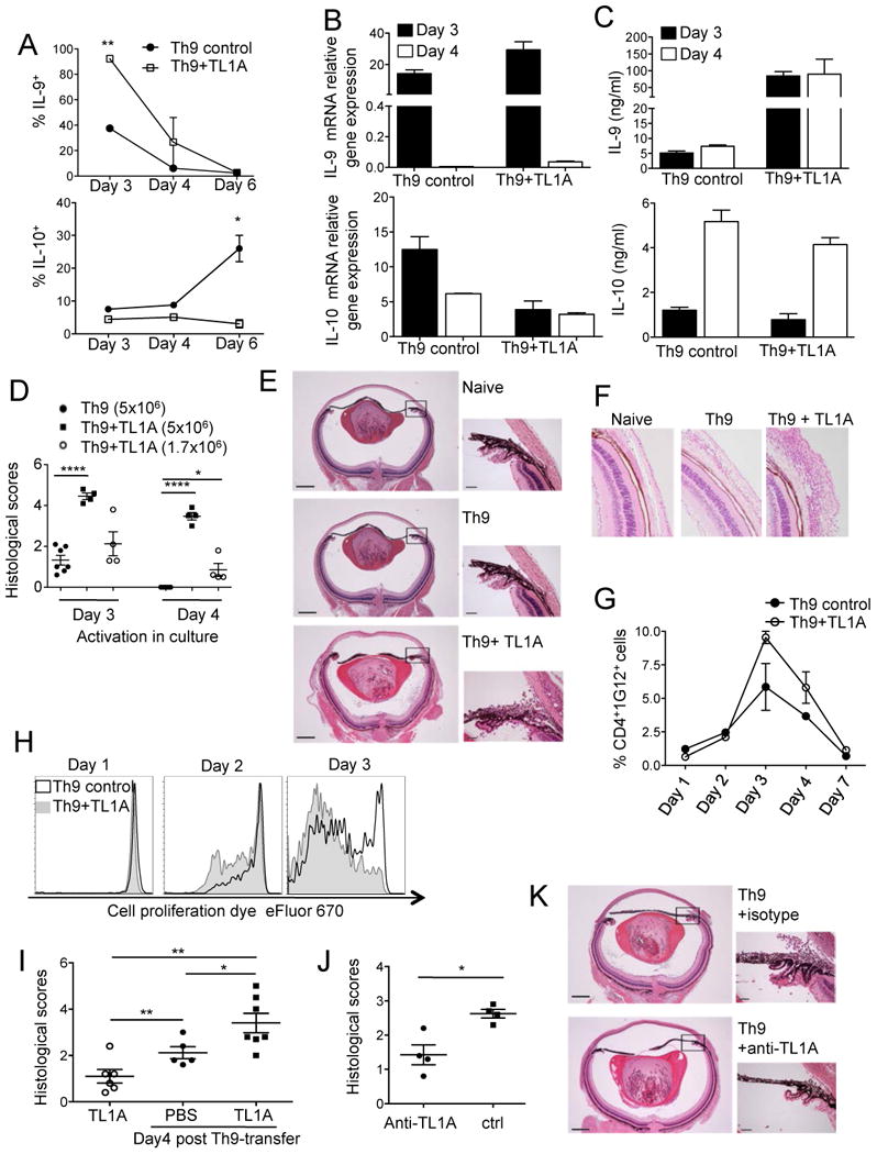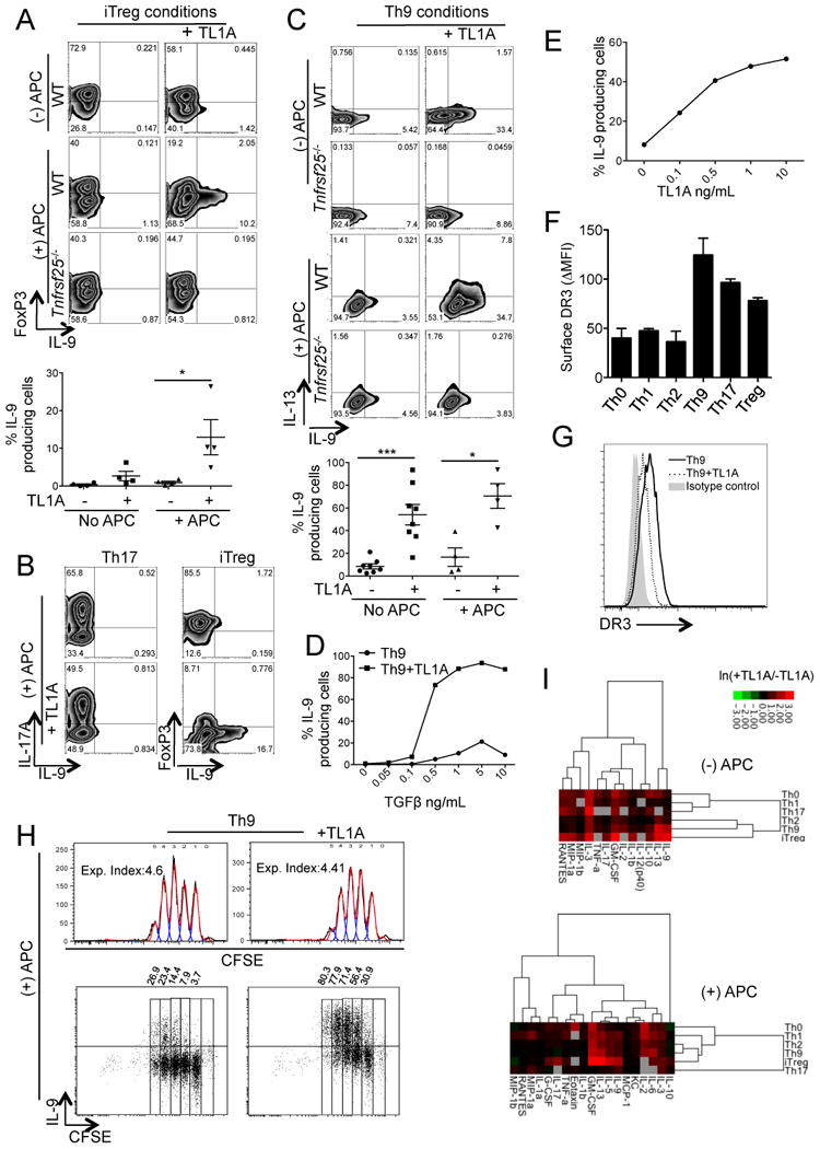 The TNF family cytokine TL1A (Tnfsf15) costimulates T cells and type 2 innate lymphocytes (ILC2) through its receptor DR3 (Tnfrsf25). DR3-deficient mice have reduced T cell accumulation at the site of inflammation and reduced ILC2-dependent immune responses in a number of models of autoimmune and allergic diseases. In allergic lung disease models, immunopathology and local Th2 and ILC2 accumulation is reduced in DR3-deficient mice despite normal systemic priming of Th2 responses and generation of T cells secreting IL-13 and IL-4, prompting the question of whether TL1A promotes the development of other T cell subsets that secrete cytokines to drive allergic disease. In this study, we find that TL1A potently promotes generation of murine T cells producing IL-9 (Th9) by signaling through DR3 in a cell-intrinsic manner. TL1A enhances Th9 differentiation through an IL-2 and STAT5-dependent mechanism, unlike the TNF-family member OX40, which promotes Th9 through IL-4 and STAT6. Th9 differentiated in the presence of TL1A are more pathogenic, and endogenous TL1A signaling through DR3 on T cells is required for maximal pathology and IL-9 production in allergic lung inflammation. Taken together, these data identify TL1A-DR3 interactions as a novel pathway that promotes Th9 differentiation and pathogenicity. TL1A may be a potential therapeutic target in diseases dependent on IL-9.
