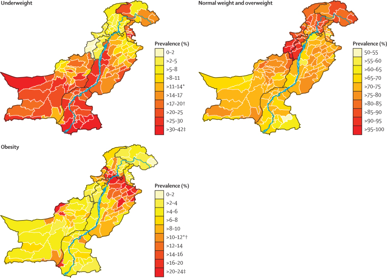 Findings: Stunting prevalence in Pakistan's districts ranged between 22% (95% credible interval 19-26) and 76% (69-83); the lowest figures for wasting and underweight were both less than 2·5% and the highest were 42% (34-50) for wasting and 54% (49-59) for underweight. In 106 districts, more women were overweight than were underweight; in 49 of these districts more women were obese than were underweight. Children were better nourished if their mothers were taller or had higher weight, if they lived in wealthier households, and if their mothers had 10 or more years of education. Severe food insecurity was associated with worse nutritional outcomes for both children and women.