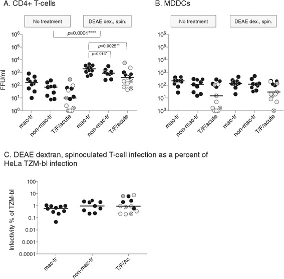 Results: Highly mac-tropic Envs mediated highest infectivity for primary T-cells, Jurkat/CCR5 cells, myeloid dendritic cells, macrophages, and HeLa TZM-bl cells, although this was most dramatic on macrophages. Infection of primary T-cells mediated by all Envs was low. However, infection of T-cells was greatly enhanced by increasing virus attachment with DEAE dextran and spinoculation, which enhanced the three Env+ virus groups to similar extents. Dendritic cell capture of viruses and trans-infection also greatly enhanced infection of primary T-cells. In trans-infection assays, non-mac-tropic R5 Envs were preferentially enhanced and those from late disease mediated levels of T-cell infection that were equivalent to those mediated by mac-tropic Envs.