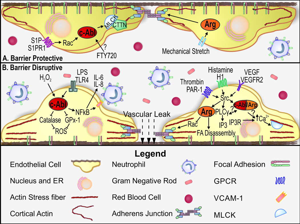 The vascular endothelium separates circulating fluid and inflammatory cells from the surrounding tissues. Vascular leak occurs in response to wide-spread inflammatory processes, such as sepsis and acute respiratory distress syndrome, because of the formation of gaps between endothelial cells. Although these disorders are leading causes of mortality in the intensive care unit, no medical therapies exist to restore endothelial cell barrier function. Recent evidence highlights a key role for the Abl family of nonreceptor tyrosine kinases in regulating vascular barrier integrity. These kinases have well-described roles in cancer progression and neuronal morphogenesis, but their functions in the vasculature have remained enigmatic until recently. The Abl family kinases, c-Abl (Abl1) and Abl related gene (Arg, Abl2), phosphorylate several cytoskeletal effectors that mediate vascular permeability, including nonmuscle myosin light chain kinase, cortactin, vinculin, and β-catenin. They also regulate cell-cell and cell-matrix junction dynamics, and the formation of actin-based cellular protrusions in multiple cell types. In addition, both c-Abl and Arg are activated by hyperoxia and contribute to oxidant-induced endothelial cell injury. These numerous roles of Abl kinases in endothelial cells and the current clinical usage of imatinib and other Abl kinase inhibitors have spurred recent interest in repurposing these drugs for the treatment of vascular barrier dysfunction. This review will describe the structure and function of Abl kinases with an emphasis on their roles in mediating vascular barrier integrity. We will also provide a critical evaluation of the potential for exploiting Abl kinase inhibition as a novel therapy for inflammatory vascular leak syndromes.