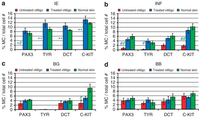 In vitiligo, the autoimmune destruction of epidermal melanocytes produces white spots that can be repigmented by melanocyte precursors from the hair follicles, following stimulation with UV light. We examined by immunofluorescence the distribution of melanocyte markers (C-KIT, DCT, PAX3, and TYR) coupled with markers of proliferation (KI-67) and migration (MCAM) in precursors and mature melanocytes from the hair follicle and the epidermis of untreated and narrow band UVB (NBUVB)-treated human vitiligo skin. NBUVB was associated with a significant increase in the number of melanocytes in the infundibulum and with restoration of the normal melanocyte population in the epidermis, which was lacking in the untreated vitiligo. We identified several precursor populations (melanocyte stem cells, melanoblasts, and other immature phenotypes), and progressively differentiating melanocytes, some with putative migratory and/or proliferative abilities. The primary melanocyte germ was present in the untreated and treated hair follicle bulge, whereas a possible secondary melanocyte germ composed of C-KIT+ melanocytes was found in the infundibulum and interfollicular epidermis of UV-treated vitiligo. This is an exceptional model for studying the mobilization of melanocyte stem cells in human skin. Improved understanding of this process is essential for designing better treatments for vitiligo, ultimately based on melanocyte stem cell activation and mobilization.
