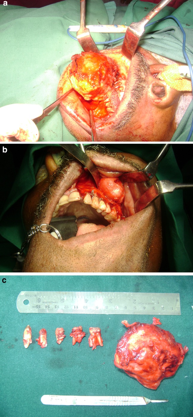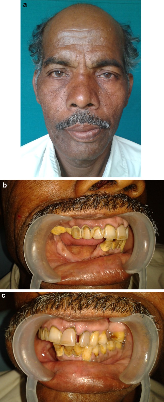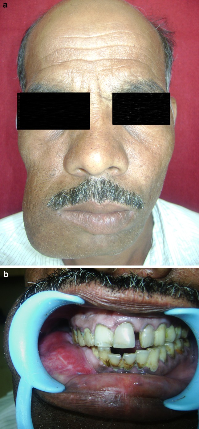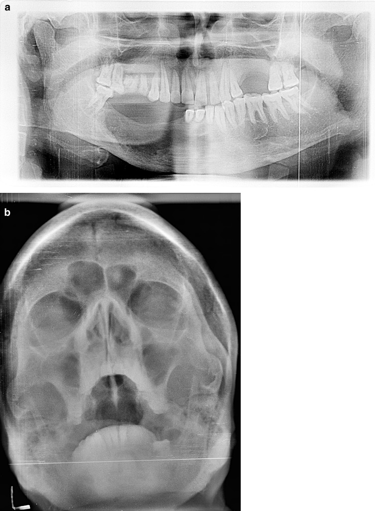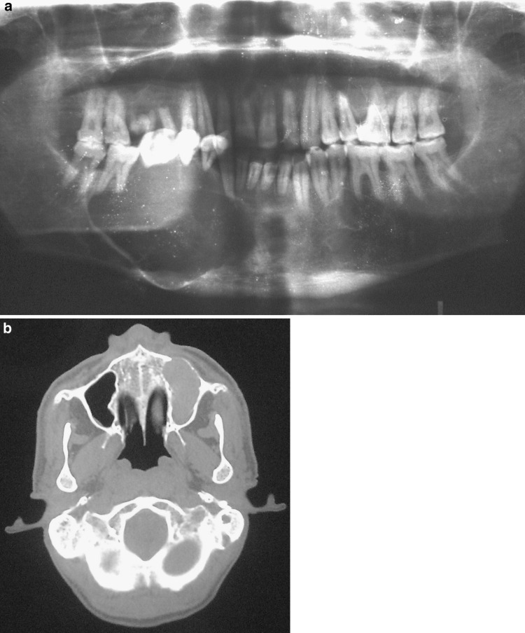 Cemento-ossifying fibroma (COF) is a benign fibro osseous lesion of the jaws which has been described as a demarcated or rarely encapsulated neoplasm consisting of fibrous tissue and varying amounts of mineralized material resembling bone and/or cementum (Dinkar et al. in IJDA 2(4):45-47, 2010). Majority of lesions occur in the mandible and only few cases of COFs of the maxillary sinus and bilateral COFs of the mandible have been reported in literature (Dinkar et al. in IJDA 2(4):45-47, 2010; Tamiolakis et al. in Acta Stomatol Croat 39(3):319-321, 2005; Hamner et al. in Oral Surg Oral Med Oral Pathol 26(4):579-587, 1968; Gunaseelan et al. in Oral Med Oral Pathol Oral Radiol Endod 104:e21-e25, 2007). These lesions have a very low recurrence rate (Ertug et al. in Quintessence Int 35(10):808-810, 2004) and are generally treated by enucleation. In this paper we present a rare case of COF occurring in both the maxilla and mandible of the same patient. Only one such case (Takeda and Fujioka in Int J Oral Maxillofac Surg 16(3):368-371, 1987) has been reported in literature so far.