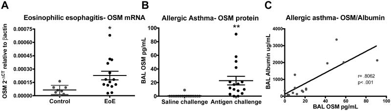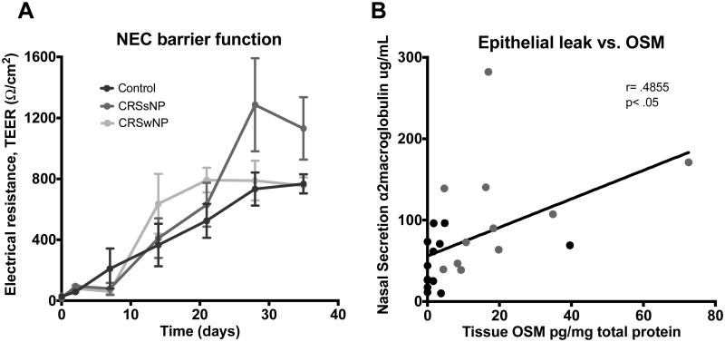 Results: Analysis of samples from patients with CRS showed that OSM mRNA and protein levels were highly increased in nasal polyps compared with those seen in control uncinate tissue (P < .05). OSM levels were also increased in bronchoalveolar lavage fluid of allergic asthmatic patients after segmental allergen challenge and in esophageal biopsy specimens from patients with eosinophilic esophagitis. OSM stimulation of air-liquid interface cultures resulted in reduced barrier function, as measured by decreased transepithelial electrical resistance and increased fluorescein isothiocyanate-dextran flux (P < .05). Alterations in barrier function by OSM were reversible, and the viability of epithelial cells was unaffected. OSM levels in lysates of nasal polyps and uncinate tissue positively correlated with levels of α2-macroglobulin, a marker of epithelial leak, in localized nasal secretions (r = 0.4855, P < .05).
