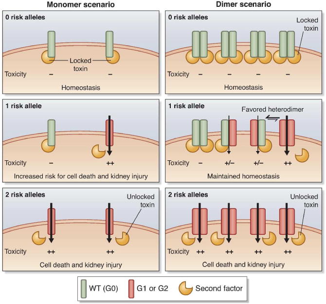 The discovery that two common APOL1 alleles were strongly associated with nondiabetic kidney diseases in African descent populations led to hope for improved diagnosis and treatment. Unfortunately, we still do not have a clear understanding of the biological function played by APOL1 in podocytes or other kidney cells, nor how the renal risk alleles initiate the development of nephropathies. Important clues for APOL1 function may be gleaned from the natural defense mechanism of APOL1 against trypanosome infections and from similar proteins (e.g., diphtheria toxin, mammalian Bcl-2 family members). This review provides an update on the biological functions for circulating (trypanosome resistance) and intracellular (emerging role for autophagy) APOL1. Further, we introduce a multimer model for APOL1 in kidney cells that reconciles the gain-of-function variants with the recessive inheritance pattern of APOL1 renal risk alleles.
