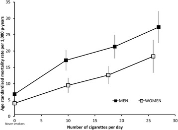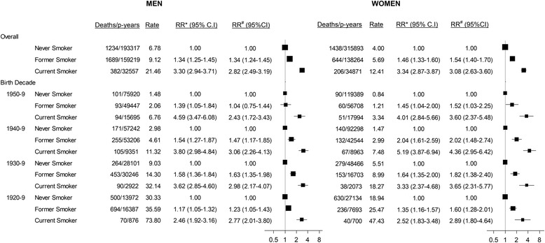 Results: Overall, 5,593 deaths accrued during follow-up (874,120 person-years; mean: 4.26 years); 7.7% of participants were current smokers and 34.1% past smokers at baseline. Compared to never-smokers, the adjusted RR (95% CI) of mortality was 2.96 (2.69-3.25) in current smokers and was similar in men (2.82 (2.49-3.19)) and women (3.08 (2.63-3.60)) and according to birth cohort. Mortality RRs increased with increasing smoking intensity, with around two- and four-fold increases in mortality in current smokers of ≤14 (mean 10/day) and ≥25 cigarettes/day, respectively, compared to never-smokers. Among past smokers, mortality diminished gradually with increasing time since cessation and did not differ significantly from never-smokers in those quitting prior to age 45. Current smokers are estimated to die an average of 10 years earlier than non-smokers.