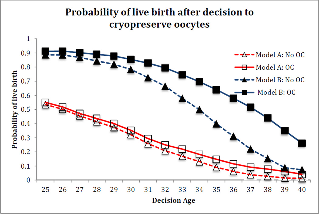 Intervention(s): Decision to cryopreserve oocytes from age 25 years to age 40 years versus taking no action.