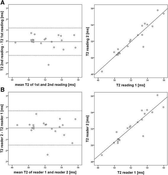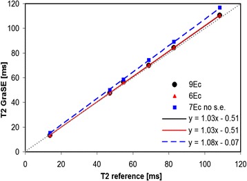Results: In-vitro studies revealed the need for well defined sequence settings to obtain accurate T2-RT measurements with GraSE. An optimized 6-echo GraSE sequence yielded an excellent agreement with the gold standard Carr-Purcell-Meiboom-Gill sequence. Global myocardial T2 relaxation times in healthy volunteers was 52.2 ± 2.0 ms (mean ± standard deviation). Mean difference between repeated examinations (n = 5) was -0.02 ms with 95% limits of agreement (LoA) of [-4.7; 4.7] ms. Intra-reader and inter-reader agreement was excellent with mean differences of -0.1 ms, 95% LoA = [-1.3; 1.2] ms and 0.1 ms, 95% LoA = [-1.5; 1.6] ms, respectively (n = 20). In patients with acute myocardial injury global myocardial T2-RTs were prolonged (mean: 61.3 ± 6.7 ms).