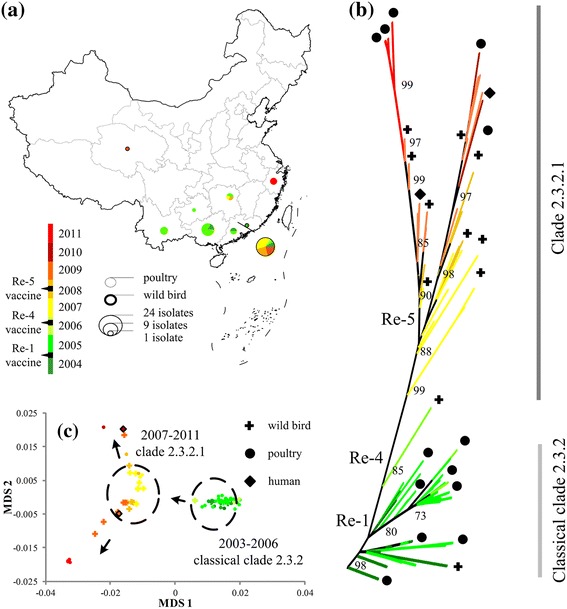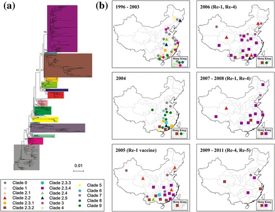 Results: Results showed obvious spatial and temporal clusters of H5N1 outbreaks on different scales, which may have been associated with poultry and wild-bird transmission modes of H5N1 viruses. Lead-lag relationships were found among poultry and wild-bird outbreaks and human cases. Human cases were preceded by poultry outbreaks, and wild-bird outbreaks were led by human cases. Each clade has gained its own unique spatiotemporal and genetic dominance. Genetic diversity of the H5N1 virus decreased significantly between 1996 and 2011; presumably under strong selective pressure of vaccination. Mean evolutionary rates of H5N1 virus increased after vaccination was adopted in China. A clear signature of positively selected sites in the clade 2.3.2 virus was discovered and this may have resulted in the emergence of clade 2.3.2.1.