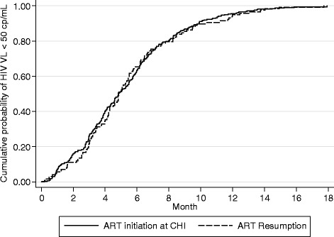 Results: 136 patients who resumed cART for a median (IQR) of 32 (18-51) months were compared with 377 patients who started cART during CHI for a median of 45 (22-57) months. Most patients (97%) achieved HIV-RNA <50 cp/mL after similar times in the two groups. The CD4 cell count rose similarly in the two groups during the first 12 months. However, after 12 months, patients who started cART during CHI had a better immunological response than those who resumed cART (p = 0.01); therefore, at 36 months, the gains in √CD4 cells/mm(3) and CD4% were significantly greater in patients who started treatment during CHI.