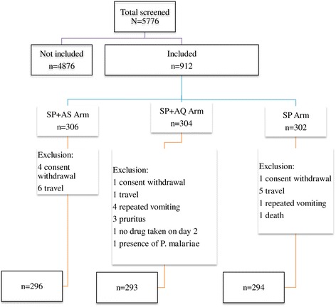 Results: Overall 912 children aged between six to 59 months, with uncomplicated P. falciparum malaria were recruited. Baseline characteristics were similar in the three treatment arms. Crude ACPRs were 94.9%; 98.6% and 93.5% for SP + AS; SP + AQ and SP alone arms respectively (SP + AS versus SP + AQ, p = 0.01; SP + AS versus SP, p = 0.5; SP + AQ versus SP, p = 0.001). After PCR adjustment, cACPRs were 99%; 100% and 97.2% for SP + AS; SP + AQ and SP alone arms, respectively (SP + AS versus SP + AQ, p = 0.25; SP + AS versus SP, p = 0.12; SP + AQ versus SP, p = 0.007).