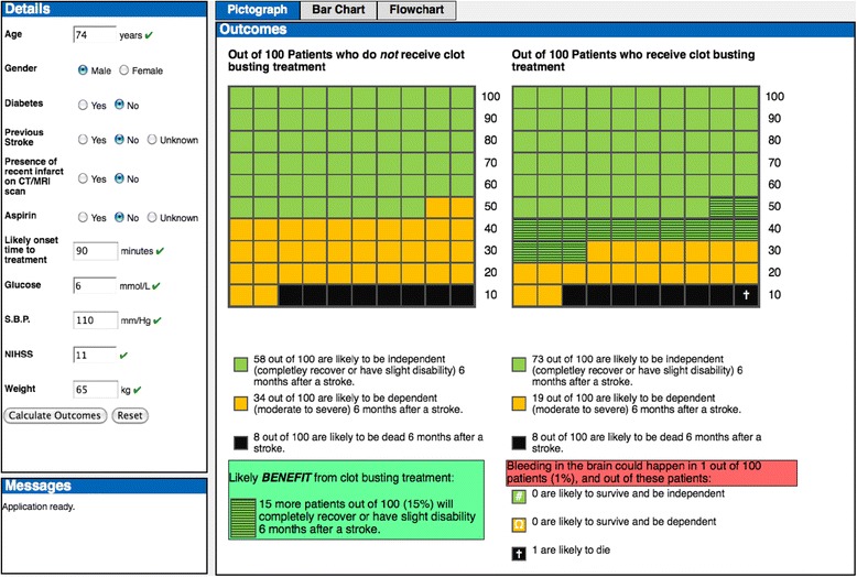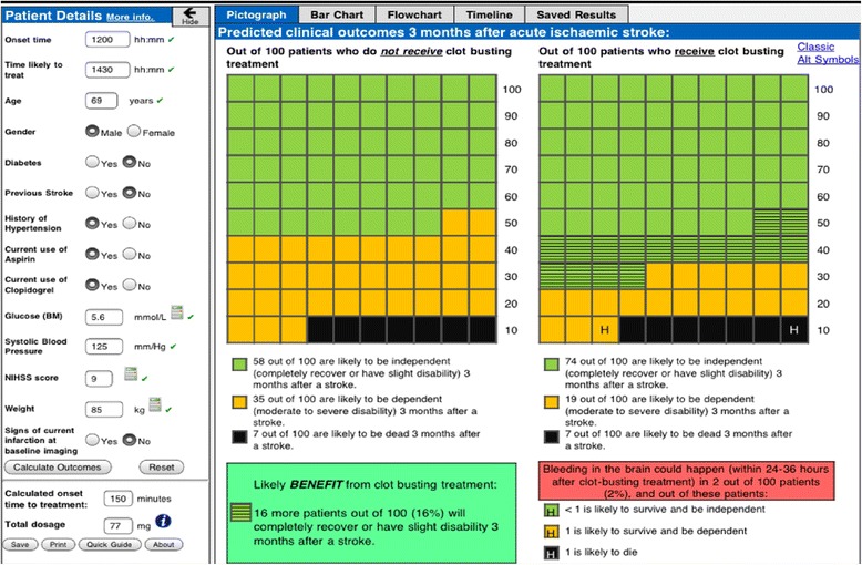 Results: COMPASS expresses predicted outcomes (bleeding complications, death, and extent of disability) with and without thrombolysis, presented numerically (percentages and natural frequencies) and graphically (pictographs, bar graphs and flowcharts). COMPASS was used for 25 patients and no adverse effects of use were reported. Median time in use was 2.8 minutes. Graphical risk presentations were shared with 14 patients/relatives. Clinicians (n = 10) valued the patient-specific predictions of benefit from thrombolysis, and the support of better risk communication with patients/relatives. Patients (n = 2) and relatives (n = 6) reported that graphical risk presentations facilitated understanding of benefits/risks of thrombolysis. Additional features (e.g. dosage calculator) were suggested and subsequently embedded within COMPASS to enhance usability.