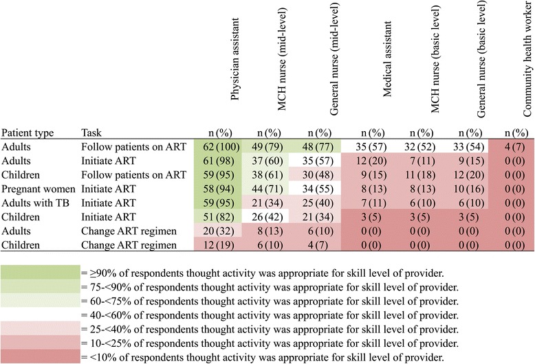 Background: Task shifting is a common strategy to deliver antiretroviral therapy (ART) in resource-limited settings and is safe and effective if implemented appropriately. Consensus among stakeholders is necessary to formulate clear national policies that maintain high-quality care. We sought to understand key stakeholders' opinions regarding task shifting of HIV care in Mozambique and to characterize which specific tasks stakeholders considered appropriate for specific cadres of health workers.
