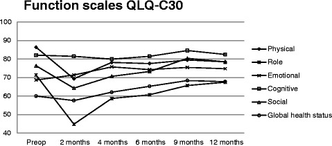 Results: There was a significant QOL nadir at 2 months compared to 12 months after surgery (QLQ-C30 function scales p < 0.001, symptom scales p < 0.001, QLQ-OES18 scales p < 0.001). Treatment with proton-pump inhibitors was associated with enhanced QOL according to QLQ-C30 symptom scales (p = 0.003) and OES-18 scales (p = 0.015), but age, gender and American Society of Anaesthesiologists classification did not significantly impact QOL.