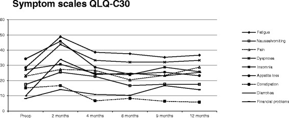 Methods: Patients operated on for adenocarcinoma or squamous cell cancer of the oesophagus were included in this study. Seventy-nine patients completed the European Organisation for Research and Treatment of Cancer QOL questionnaires (QLQ-C30 and QLQ-OES18) before and 2, 4, 6, 9, and 12 months after surgery. A general linear model with repeated measurement analysis of variance was used for statistical testing.