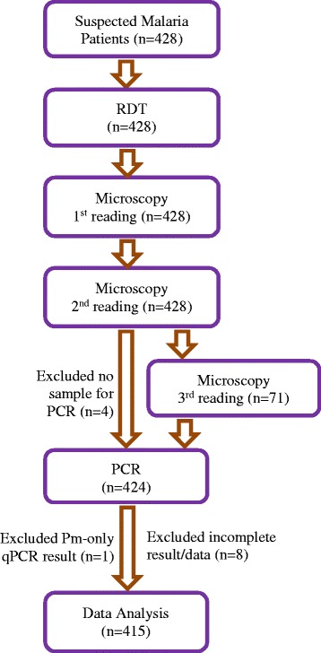 Results: Overall malaria positive samples from qPCR was 42.2% (175/415 samples); and from matching blood slides 40.5% (168/415) of which those infections with relatively low parasite densities ≤100/μl blood was 5.7% of P. falciparum and 16.5% of P. vivax samples examined. Overall RDT performance when compared with microscopy for detecting P. falciparum was Sn:92%, Sp:96.6%, PPV:88%, NPV:97.8%, Kappa:0.87; and for P. vivax Sn:72.9%, Sp:99.1%, PPV:95.4%, NPV:93.4%, Kappa:0.79. Overall RDT performance when compared with qPCR for detecting P. falciparum was Sn:92%, Sp:96.6%, PPV:88%, NPV:97.8%, Kappa:0.87; and for P. vivax Sn:66%, Sp:99.1%, PPV:95.4%, NPV:90.9%, Kappa:0.73.
