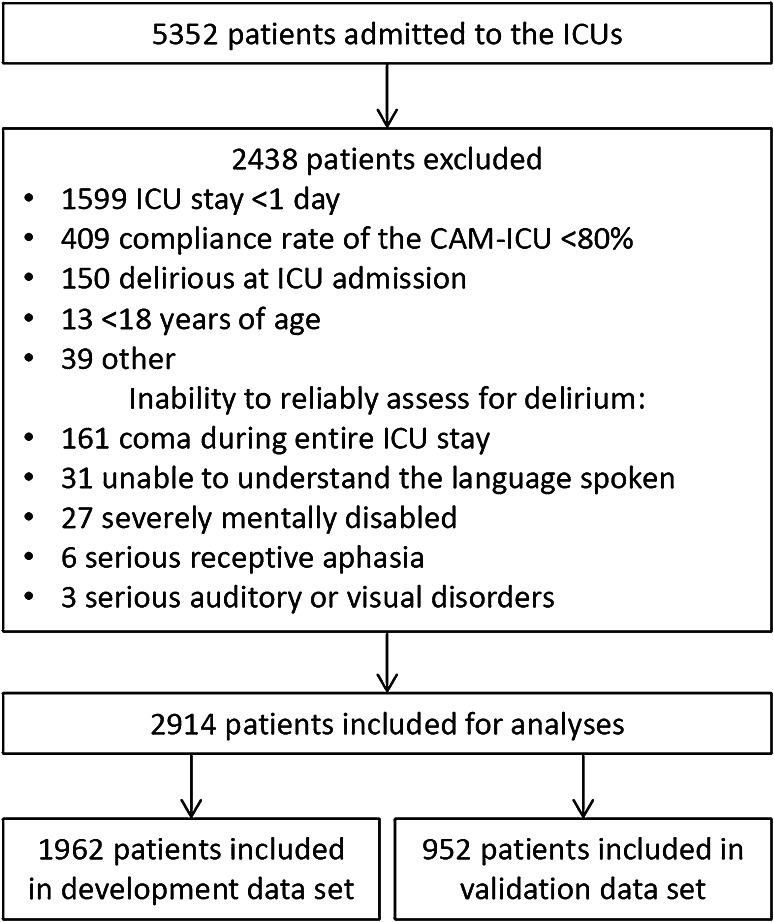 Purpose: To develop and validate a model based on data available at ICU admission to predict delirium development during a patient's complete ICU stay and to determine the predictive value of this model in relation to the time of delirium development.