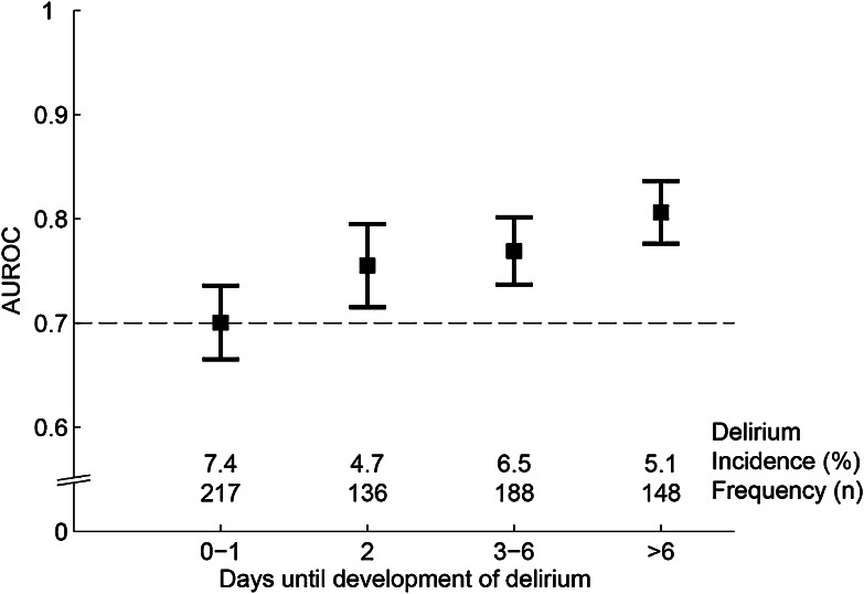 Results: In total, 2914 patients were included. Delirium incidence was 23.6%. The E-PRE-DELIRIC model consists of nine predictors assessed at ICU admission: age, history of cognitive impairment, history of alcohol abuse, blood urea nitrogen, admission category, urgent admission, mean arterial blood pressure, use of corticosteroids, and respiratory failure. The area under the receiver operating characteristic curve (AUROC) was 0.76 [95% confidence interval (CI) 0.73-0.77] in the development dataset and 0.75 (95% CI 0.71-0.79) in the validation dataset. The model was well calibrated. AUROC increased from 0.70 (95% CI 0.67-0.74), for delirium that developed <2 days, to 0.81 (95% CI 0.78-0.84), for delirium that developed >6 days.