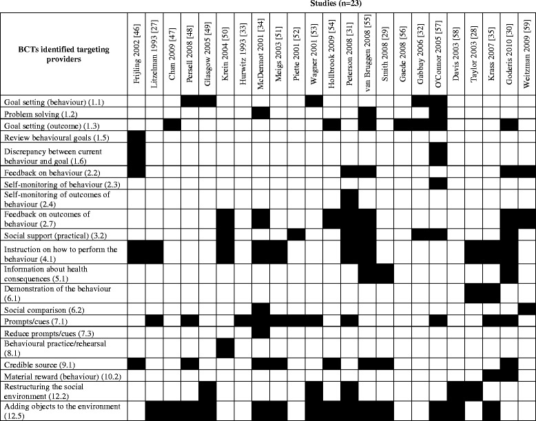 Results: Less than a quarter of possible BCTs within the BCTTv1 were identified. For implementation interventions targeting providers, the most commonly identified BCTs included the following: adding objects to the environment, prompts/cues, instruction on how to perform the behaviour, credible source, goal setting (outcome), feedback on outcome of behaviour, and social support (practical). For implementation interventions also targeting patients, the most commonly identified BCTs included the following: prompts/cues, instruction on how to perform the behaviour, information about health consequences, restructuring the social environment, adding objects to the environment, social support (practical), and goal setting (behaviour). The BCTTv1 mapped well onto implementation interventions directly targeting clinicians and patients and could also be used to examine the impact of system-level interventions on clinician and patient behaviour.