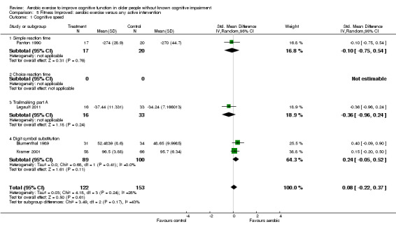 Data collection and analysis: Two review authors independently extracted the data from included trials. We grouped cognitive outcome measures into eleven categories covering attention, memory, perception, executive functions, cognitive inhibition, cognitive speed and motor function. We used the mean difference (or standardised mean difference) between groups as the measure of the treatment effect and synthesised data using a random-effects model. We conducted separate analyses to compare aerobic exercise interventions with no intervention and with other exercise, social or cognitive interventions. Also, we performed analyses including only trials in which an increase in the cardiovascular fitness of participants had been demonstrated.