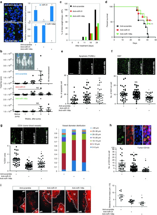 Using in silico analysis of The Cancer Genome Atlas (TCGA), we identified microRNAs associated with glioblastoma (GBM) survival, and predicted their functions in glioma growth and progression. Inhibition of two "risky" miRNAs, miR-148a and miR-31, in orthotopic xenograft GBM mouse models suppressed tumor growth and thereby prolonged animal survival. Intracranial tumors treated with uncomplexed miR-148a and miR-31 antagomirs exhibited reduced proliferation, stem cell depletion, and normalized tumor vasculature. Growth-promoting functions of these two miRNAs were, in part, mediated by the common target, the factor inhibiting hypoxia-inducible factor 1 (FIH1), and the downstream pathways involving hypoxia-inducible factor HIF1α and Notch signaling. Therefore, miR-31 and miR-148a regulate glioma growth by maintaining tumor stem cells and their niche, and providing the tumor a way to activate angiogenesis even in a normoxic environment. This is the first study that demonstrates intratumoral uptake and growth-inhibiting effects of uncomplexed antagomirs in orthotopic glioma.