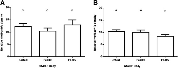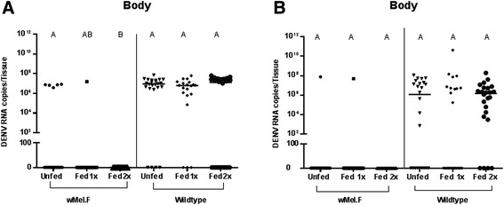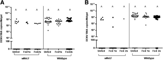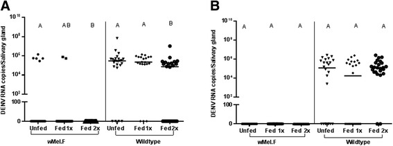 Methods: The Wolbachia infected Aedes aegypti mosquito line was used for the study. There were three treatment groups; a non-blood fed control, a second group fed once and a third group fed twice on human blood. All groups were orally infected with DENV-2 and then their midguts and salivary glands were dissected 10-11 days post infection. RNA/DNA was simultaneously extracted from each tissue and subsequently used for DENV RNA copies and Wolbachia density quantification, respectively.