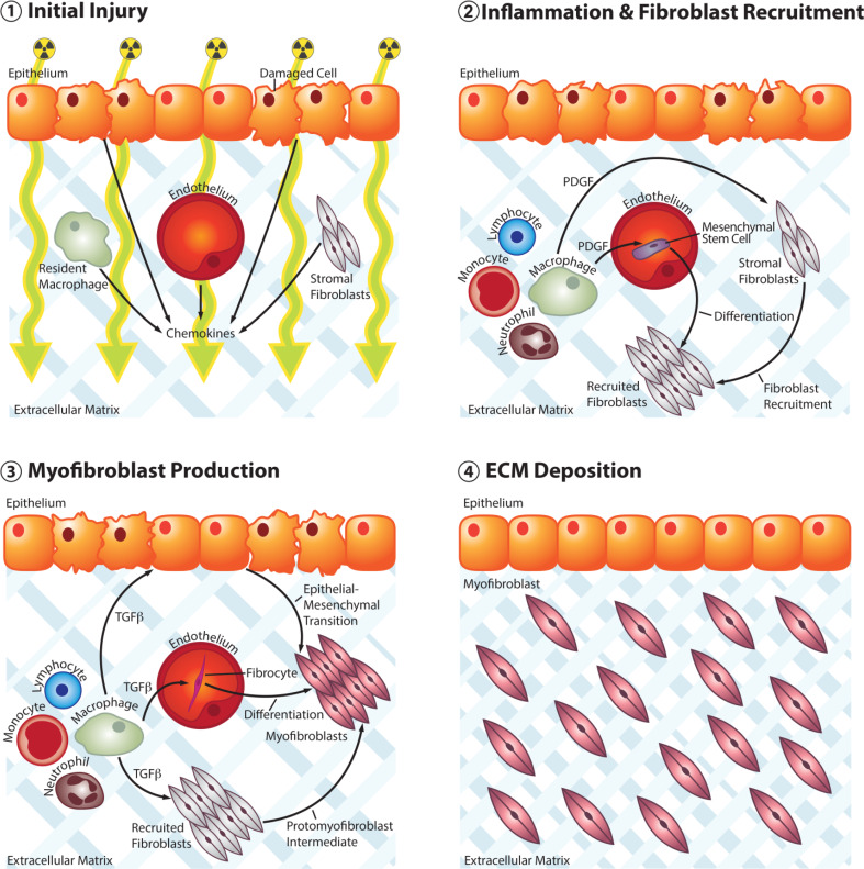Results: RIF is the result of a misguided wound healing response. In addition to causing direct DNA damage, ionizing radiation generates reactive oxygen and nitrogen species that lead to localized inflammation. This inflammatory process ultimately evolves into a fibrotic one characterized by increased collagen deposition, poor vascularity, and scarring. Tumor growth factor beta serves as the primary mediator in this response along with a host of other cytokines and growth factors. Current therapies have largely been directed toward these molecular targets and their associated signaling pathways.