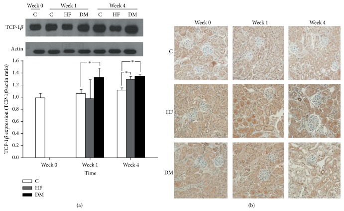 In cell model, we discovered the association between chaperonin-containing t-complex polypeptide 1 subunit β (TCP-1β) and early diabetic nephropathy (DN). In this study, we further explored the relationships between TCP-1β and type 2 diabetic mellitus (DM). To mimic the clinical hyperfiltration state, a type 2 DM mice model was established by feeding a high-fat diet in combination with treatment of streptozotocin and nicotinamide. Blood and urine were collected to determine creatinine clearance (C cr), and kidney tissues were harvested for evaluation of TCP-1β expression by immunohistochemistry and Western blot. Meanwhile, clinical subjects of healthy controls and type 2 DM were recruited to strengthen the evidence with urine TCP-1β. Results showed that C cr and the expression of TCP-1β in kidney were significantly higher one week after hyperglycemia development, suggesting that the hyperfiltration state was successfully established in the mice model. TCP-1β was expressed predominantly on renal tubules. By using the estimated glomerular filtration rate to index progression in clinical investigation, urine TCP-1β level was associated with the hyperfiltration phase in type 2 DM patients. Conclusively, we confirmed that TCP-1β is a possible biomarker for early nephropathy of type 2 DM, but further mechanistic study to elucidate its cause and pathway is needed.