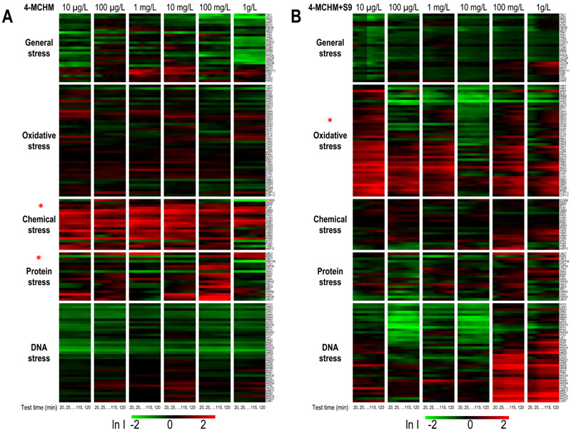 The large-scale chemical spill on January 9, 2014 from coal processing and cleaning storage tanks of Freedom Industries in Charleston affected the drinking water supply to 300,000 people in Charleston, West Virginia metropolitan, while the short-term and long-term health impacts remain largely unknown and need to be assessed and monitored. There is a lack of publically available toxicological information for the main contaminant 4-methyl-1-cyclohexanemethanol (4-MCHM). Particularly, little is known about 4-MCHM metabolites and their toxicity. This study reports timely and original results of the mechanistic toxicity assessment of 4-MCHM and its metabolites via a newly developed quantitative toxicogenomics approach, employing proteomics analysis in yeast cells and transcriptional analysis in human cells. These results suggested that, although 4-MCHM is considered only moderately toxic based on the previous limited acute toxicity evaluation, 4-MCHM metabolites were likely more toxic than 4-MCHM in both yeast and human cells, with different toxicity profiles and potential mechanisms. In the yeast library, 4-MCHM mainly induced chemical stress related to transmembrane transport and transporter activity, while 4-MCHM metabolites of S9 mainly induced oxidative stress related to antioxidant activity and oxidoreductase activity. With human A549 cells, 4-MCHM mainly induced DNA damage-related biomarkers, which indicates that 4-MCHM is related to genotoxicity due to its DNA damage effect on human cells and therefore warrants further chronic carcinogenesis evaluation.