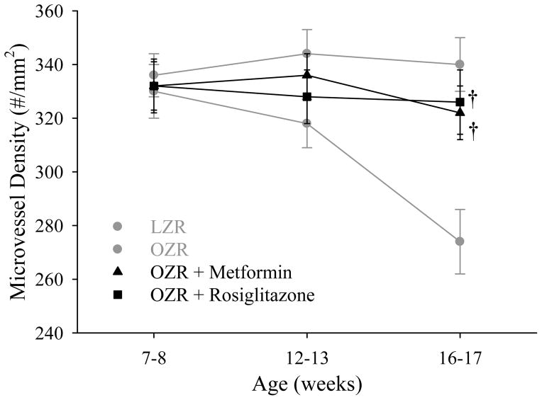 Results: OZR exhibited a progressive rarefaction (to ~80% control MVD) of the cortical microvascular networks vs. lean Zucker rats. Chronic treatment with antihypertensive agents (captopril/hydralazine) had limited effectiveness in blunting rarefaction, although treatments improving glycemic control (metformin/rosiglitazone) were superior, maintaining ~94% control MVD. Chronic treatment with the antioxidant TEMPOL severely blunted rarefaction in OZR, although this ameliorative effect was prevented by concurrent NOS inhibition.