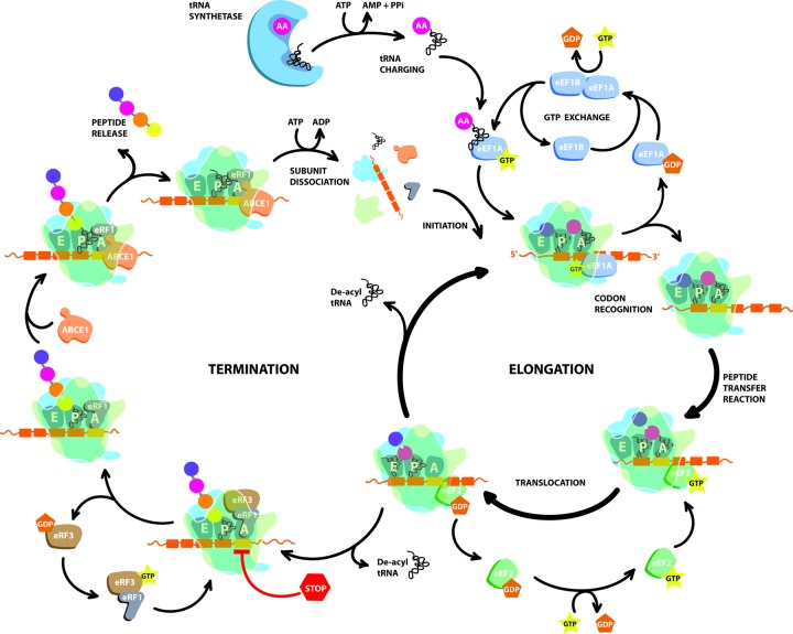 Protein synthesis is a fundamental process in gene expression that depends upon the abundance and accessibility of the mRNA transcript as well as the activity of many protein and RNA-protein complexes. Here we focus on the intricate mechanics of mRNA translation in the cytoplasm of higher plants. This chapter includes an inventory of the plant translational apparatus and a detailed review of the translational processes of initiation, elongation, and termination. The majority of mechanistic studies of cytoplasmic translation have been carried out in yeast and mammalian systems. The factors and mechanisms of translation are for the most part conserved across eukaryotes; however, some distinctions are known to exist in plants. A comprehensive understanding of the complex translational apparatus and its regulation in plants is warranted, as the modulation of protein production is critical to development, environmental plasticity and biomass yield in diverse ecosystems and agricultural settings.