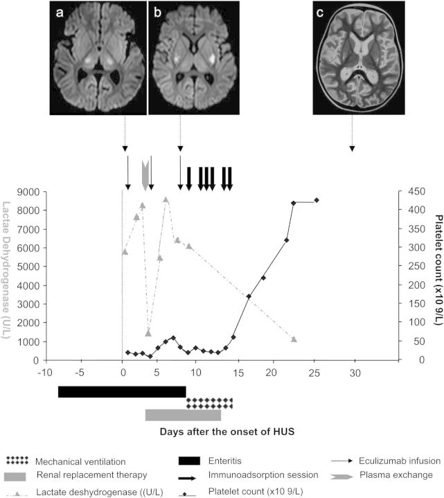 - Greinacher A, Friesecke S, Abel P, et al. Treatment of severe neurological deficits with IgG depletion through immunoadsorption in patients with Escherichia coli 0104:H4-associated haemolytic uraemic syndrome: a prospective trial. Lancet. 2011;378:1166–1173. - PubMed