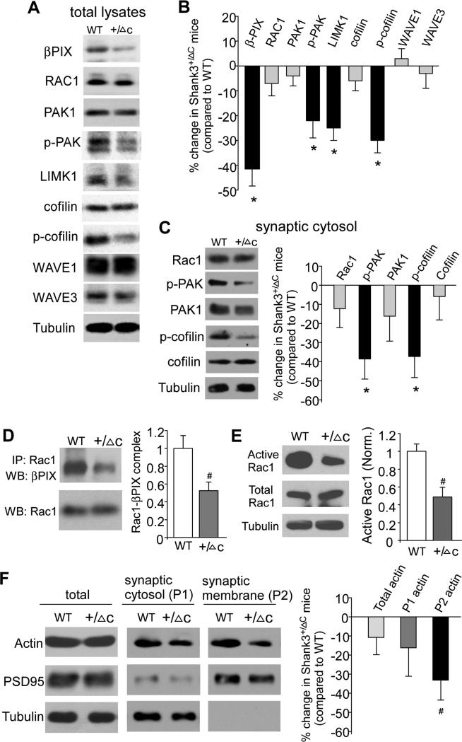 Haploinsufficiency of the Shank3 gene, which encodes a scaffolding protein at glutamatergic synapses, is a highly prevalent and penetrant risk factor for autism. Using combined behavioral, electrophysiological, biochemical, imaging, and molecular approaches, we find that Shank3-deficient mice exhibit autism-like social deficits and repetitive behaviors, as well as the significantly diminished NMDA receptor (NMDAR) synaptic function and synaptic distribution in prefrontal cortex. Concomitantly, Shank3-deficient mice have a marked loss of cortical actin filaments, which is associated with the reduced Rac1/PAK activity and increased activity of cofilin, the major actin depolymerizing factor. The social deficits and NMDAR hypofunction are rescued by inhibiting cofilin or activating Rac1 in Shank3-deficient mice and are induced by inhibiting PAK or Rac1 in wild-type mice. These results indicate that the aberrant regulation of synaptic actin filaments and loss of synaptic NMDARs contribute to the manifestation of autism-like phenotypes. Thus, targeting actin regulators provides a strategy for autism treatment.