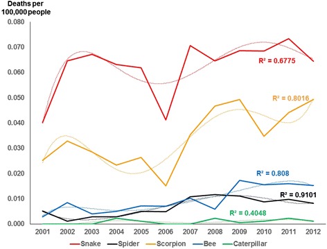 Results: In total, 1,192,667 accidents and 2,664 deaths from terrestrial venomous animals (snakes, scorpions, spiders, bees and caterpillars) were reported in Brazil during these 12 years, the circumstances of which are detailed in this study. Most envenomations and deaths were caused by snakebites and scorpion stings. However, incidence and mortality showed high regional variations. During this period, the steady and parallel increase of the cases from all the species resulted from several factors including the human population increase, gradual improvement of data collection system and, probably, environmental and socioeconomic factors affecting in a different way the incidence of envenomation by each zoological group and by region.