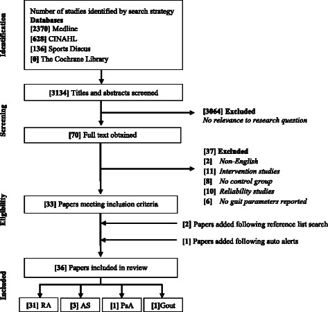 Results: Thirty six studies with quality ranging from high to low met the inclusion criteria. The majority of studies reported gait parameters in Rheumatoid arthritis (RA). The gait pattern in RA was characterised by decreased walking speed (SMD 95% CI -1.57, -2.25 to -0.89), decreased cadence (SMD -0.97, -1.49 to -0.45), decreased stride length (SMD -1.66, -1.84 to -1.49), decreased ankle power (SMD -1.36, -1.70 to -1.02), increased double limb support time (SMD 1.03, 0.84 to 1.22), and peak plantar pressures at the forefoot (SMD 1.11, 0.76 to 1.45). Walking velocity was reduced in psoriatic arthritis and gout with no differences in ankylosing spondylitis. No studies have been conducted in polymyalgia rheumatica, systemic sclerosis or systemic lupus erythematosus.
