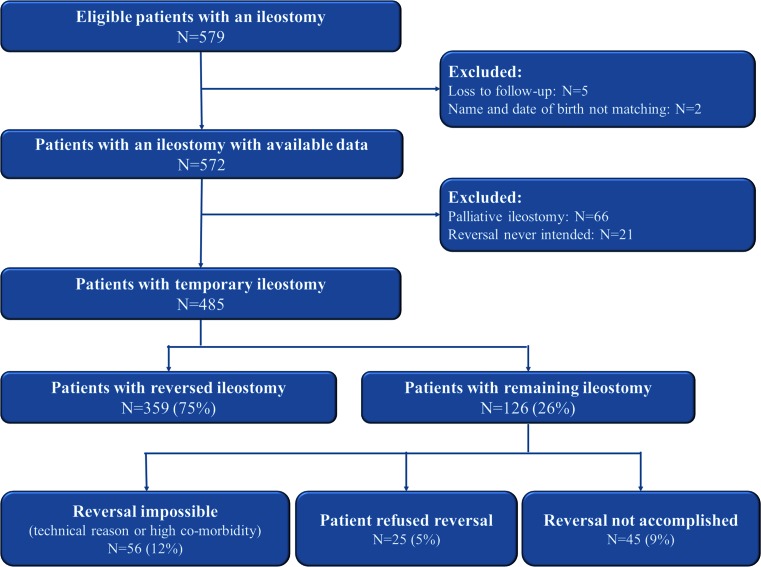 Results: Of 485 intentionally temporary ileostomies, 359 were reversed after a median of 5.6 months (IQR 3.8-8.9 months), while 126 (26%) remained permanent. End ileostomy and intra-abdominal abscess independently delayed reversal. Age, end ileostomy, higher body mass index and preoperative radiotherapy were independent factors for non-reversal. Median duration of hospitalisation for reversal was 7.0 days (5-13 days). Morbidity and mortality were 31 and 0.9%, respectively. In 20 patients (5.5%), re-ileostomy was necessary.