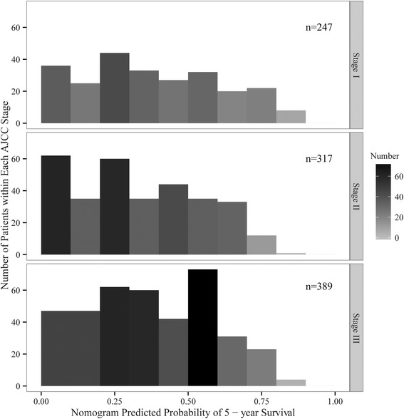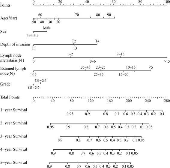 Results: In our study, six clinical associated factors (age, sex, depth of invasion, metastasized lymph nodes, examined lymph nodes, histological grade) were evaluated in the nomogram. In the training set, the nomogram exhibited superior discrimination power compared with the American Joint Committee on Cancer (AJCC) TNM classification (Harrell's C-index, 0.69 and 0.63, respectively). Calibration of the nomogram predicted survival was similar to the actual overall survival. In the validation set, the discrimination of nomogram was also better than the AJCC TNM staging system (C-index, 0.75 and 0.65, respectively), and the calibration of nomogram predicted survival was within a 10 % margin of actual overall survival.
