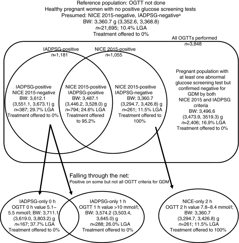 Aims/hypothesis: Gestational diabetes mellitus (GDM) is associated with increased risks to mother and child, but globally agreed diagnostic criteria remain elusive. Identification of women with GDM is important, as treatment reduces adverse outcomes such as perinatal death, shoulder dystocia and neonatal hypoglycaemia. Recently, the UK's National Institute for Health and Care Excellence (NICE) recommended new diagnostic thresholds for GDM which are different from the International Association of the Diabetes and Pregnancy Study Groups (IADPSG) criteria endorsed by the WHO. The study aim was to assess neonatal and obstetric outcomes among women who would test positive for the IADPSG criteria but negative for the NICE 2015 criteria.