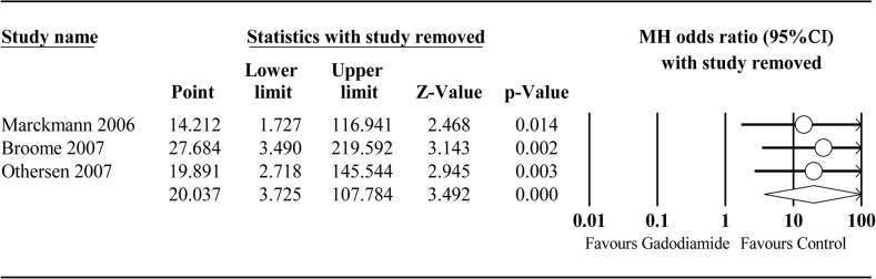 Conclusions: Although this updated meta-analysis found a significant association between GBCAs and the incidence of NSF in patients with advanced renal disease, the association decreased after 2007. More studies, especially randomized controlled trials, are warranted to examine the potential association between GBCAs other than gadodiamide and NSF.