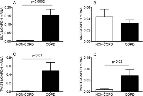 Methods: Primary HBE cells from normal subjects and COPD patients were purchased from LONZA. HLFs were derived from resected lung obtained from normal (N) and COPD (D) subjects and their conditioned medium (CM) was collected after 2-day culture in serum-free medium. The expression of epithelial and mesenchymal markers as well as EMT-related transcription factors in lung biopsies, and in HBE cells following stimulation with CM from both normal human lung fibroblasts (NHLF) and COPD human lung fibroblasts (DHLF) was evaluated by immunohistochemistry, qRT-PCR and western blot.