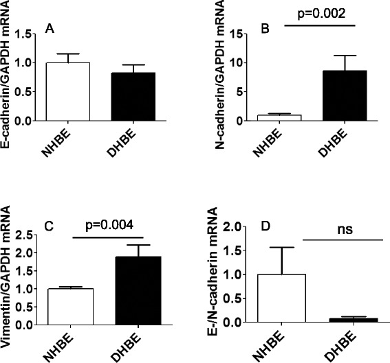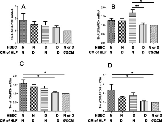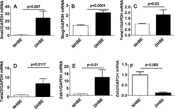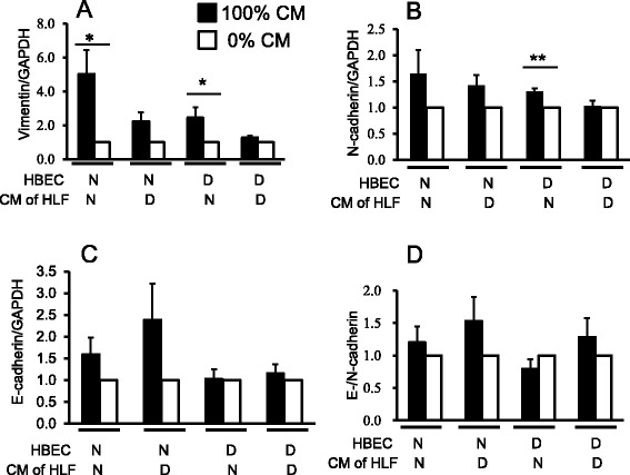 Results: Basal mRNA expression of mesenchymal markers and EMT-related transcription factors were increased in DHBE cells compared to normal human bronchial epithelial cells (NHBE) cells as well as in COPD lungs. CM from NHLF significantly induced vimentin expression in both NHBE and COPD human bronchial epithelial cells (DHBE) cells, but only increased N-cadherin expression in DHBE cells. CM from NHLF significantly induced Twist1 and Twist2 expression in NHBE cells and increased Snai2 (Slug) expression in DHBE cells. While CM from NHLF had no effect on such EMT markers, CM from DHLF significantly increased the protein expression of E-cadherin and vimentin in NHBE cells compared to control. N-cadherin expression was upregulated to a greater degree in NHBE cells than DHBE cells. Only CM from DHLF significantly increased E-/N-cadherin ratio in DHBE cells.