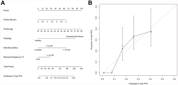 Incorporation of postoperative CT data into clinical models to predict 5-year overall and recurrence free survival after primary cytoreductive surgery for advanced ovarian cancer