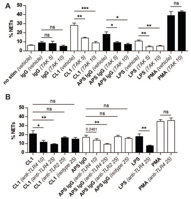 Results: Sera and plasma from patients with primary APS had elevated levels of both cell-free DNA and NETs, as compared to healthy volunteers. Freshly isolated neutrophils from patients with APS were predisposed to high levels of spontaneous NET release. Further, APS patient sera, as well as IgG purified from APS patients, stimulated NET release from control neutrophils. Human aPL monoclonal antibodies, especially those targeting β2 GPI, also enhanced NET release. The induction of APS NETs was abrogated with inhibitors of reactive oxygen species formation and Toll-like receptor 4 signaling. Highlighting the potential clinical relevance of these findings, APS NETs promoted thrombin generation.