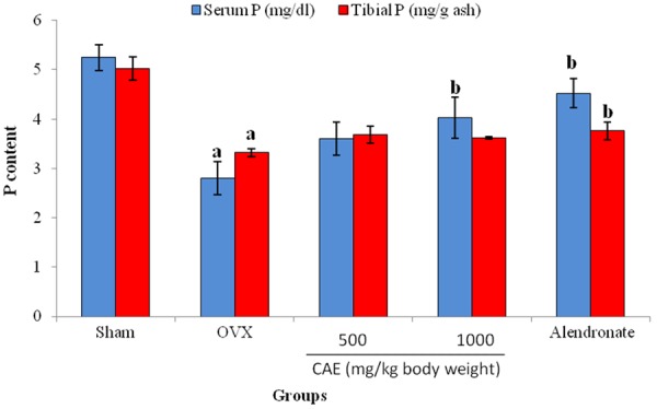 Results: The present study demonstrated that ovariectomy caused significant decrease in bone mineral; density (BMD) and content (BMC), Bone-specific alkaline phosphatase (BALP), calcium (Ca), phosphorus (P), parathyroid hormone (PTH) and calcitonin levels. Furthermore, ovariectomy induced significant elevation of tartrate-resistant acid phosphatase 5b (TRAP 5b) and receptor activator of nuclear factor (NF-kappa β) ligand (RANKL) concentration. Conversely, osteoprotegerin (OPG) and OPG/RANKL ratio were decreased following ovariectomy. The present work suggests that CAE has antiosteoporotic action against ovariectomy effects and its activity may results from its phytochemical and/or phytoestrogen contents.