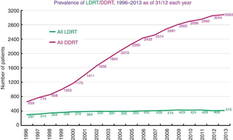 Renal Registry was started by the Hospital Authority (HA) in Hong Kong in 1995. It is an online system developed by HA. It collects all patients under care in HA, which is about 90-95 % of all requiring renal replacement therapy (RRT) in Hong Kong. The total number of patients treated increased from 3312 in 1996 to 8510 in 2013. In 2013, there were 3501 renal transplant, 1192 hemodialysis (HD) and 3817 peritoneal dialysis (PD) patients. In 2013, 1147 new patients joined the RRT program, 49.6% of them suffered from diabetic nephropathy. Glomerulonephritis and hypertension are the 2nd and 3rd most common causes of RRT in Hong Kong. The median age was 59.1 years with male to female ratio of 1.54 to 1. Hong Kong practices 'PD first' policy and the majority of the patients are on CAPD treatment. The ratio of PD to HD was 76.2% to 23.8%. Eighty-six percent of all PD patients are on CAPD; the remaining 14% are on automated peritoneal dialysis (APD). Sixty-five percent of all dialysis patients are on erythropoiesis-stimulating agent treatment. The Hong Kong Renal Registry with online real-time data input and access can provide timely data and information to facilitate patient care and management and also provides invaluable data to help in development and planning of renal services in Hong Kong.