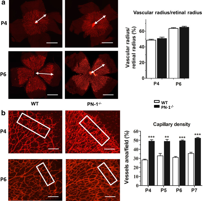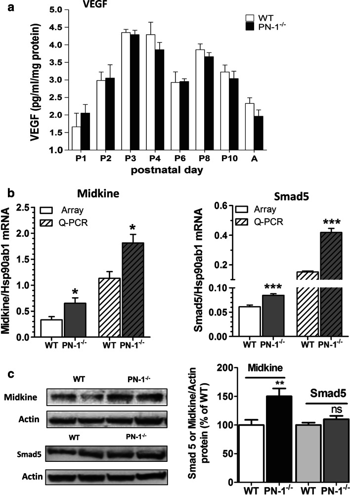 We recently identified protease nexin-1 (PN-1) or serpinE2, as a possibly underestimated player in maintaining angiogenic balance. Here, we used the well-characterized postnatal vascular development of newborn mouse retina to further investigate the role and the mechanism of action of PN-1 in physiological angiogenesis. The development of retinal vasculature was analysed by endothelial cell staining with isolectin B4. PN-1-deficient (PN-1(-/-)) retina displayed increased vascularization in the postnatal period, with elevated capillary thickness and density, compared to their wild-type littermate (WT). Moreover, PN-1(-/-) retina presented more veins/arteries than WT retina. The kinetics of retinal vasculature development, retinal VEGF expression and overall retinal structure were similar in WT and PN-1(-/-) mice, but we observed a hyperproliferation of vascular cells in PN-1(-/-) retina. Expression of PN-1 was analysed by immunoblotting and X-Gal staining of retinas from mice expressing beta-galactosidase under a PN-1 promoter. PN-1 was highly expressed in the first week following birth and then progressively decreased to a low level in adult retina where it localized on the retinal arteries. PCR arrays performed on mouse retinal RNA identified two angiogenesis-related factors, midkine and Smad5, that were overexpressed in PN-1(-/-) newborn mice and this was confirmed by RT-PCR. Both the higher vascularization and the overexpression of midkine and Smad5 mRNA were also observed in gastrocnemius muscle of PN-1(-/-) mice, suggesting that PN-1 interferes with these pathways. Together, our results demonstrate that PN-1 strongly limits physiological angiogenesis and suggest that modulation of PN-1 expression could represent a new way to regulate angiogenesis.