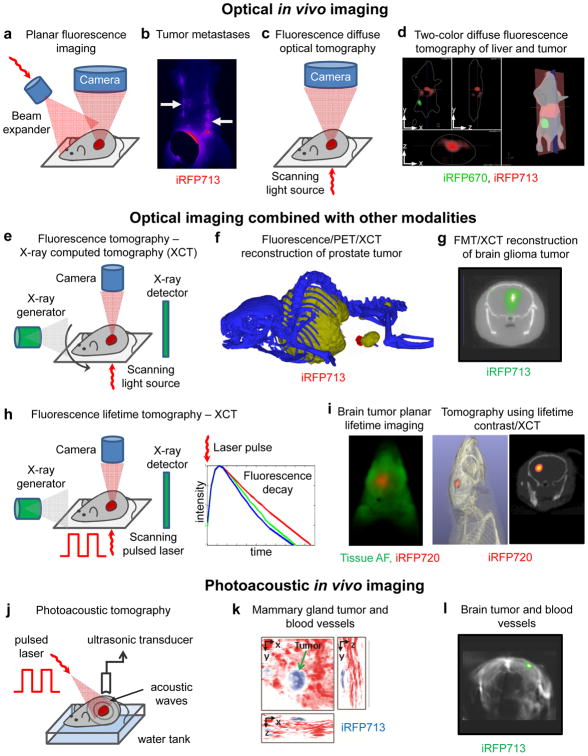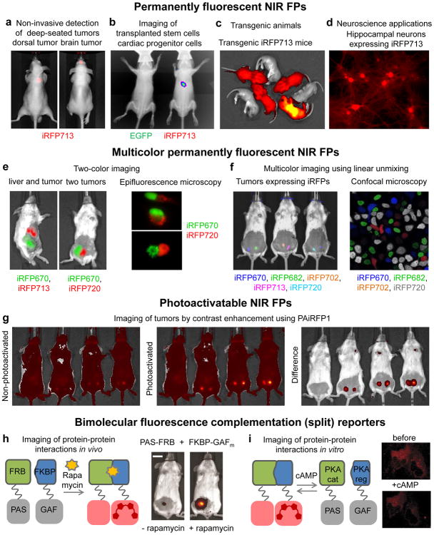 Near-infrared fluorescent proteins (NIR FPs), photoactivatable NIR FPs and NIR reporters of protein-protein interactions developed from bacterial phytochrome photoreceptors (BphPs) have advanced non-invasive deep-tissue imaging. Here we provide a brief guide to the BphP-derived NIR probes with an emphasis on their in vivo applications. We describe phenotypes of NIR FPs and their photochemical and intracellular properties. We discuss NIR FP applications for imaging of various cell types, tissues and animal models in basic and translational research. In this discussion, we focus on NIR FPs that efficiently incorporate endogenous biliverdin chromophore and therefore can be used as straightforward as GFP-like proteins. We also overview a usage of NIR FPs in different imaging platforms, from planar epifluorescence to tomographic and photoacoustic technologies.