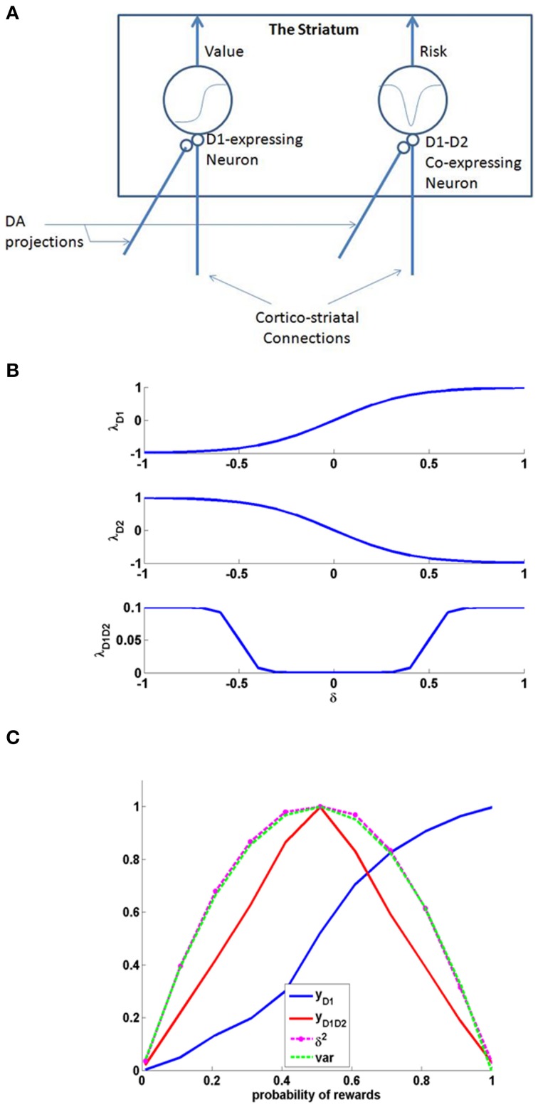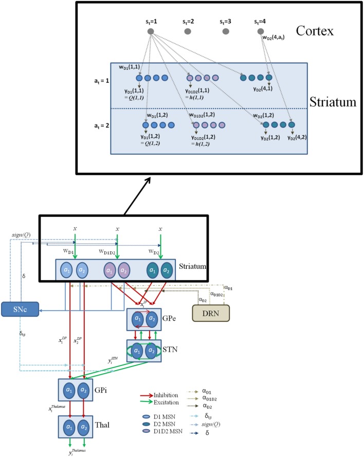 Keywords: D1 and D2 receptor co-expression; basal ganglia network; dopamine; medium spiny neurons; punishment; reward; risk; serotonin.