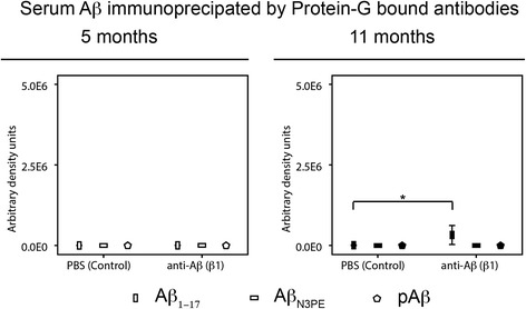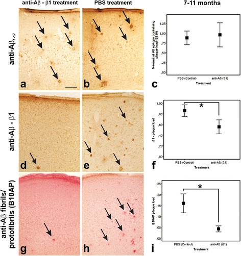 Introduction: The deposition of the amyloid β protein (Aβ) in the brain is a hallmark of Alzheimer's disease (AD). Removal of Aβ by Aβ-antibody treatment has been developed as a potential treatment strategy against AD. First clinical trials showed neither a stop nor a reduction of disease progression. Recently, we have shown that the formation of soluble and insoluble Aβ aggregates in the human brain follows a hierarchical sequence of three biochemical maturation stages (B-Aβ stages). To test the impact of the B-Aβ stage on Aβ immunotherapy, we treated transgenic mice expressing human amyloid precursor protein (APP) carrying the Swedish mutation (KM670/671NL; APP23) with the Aβ-antibody β1 or phosphate-buffered saline (PBS) beginning 1) at 3 months, before the onset of dendrite degeneration and plaque deposition, and 2) at 7 months, after the start of Aβ plaque deposition and dendrite degeneration.